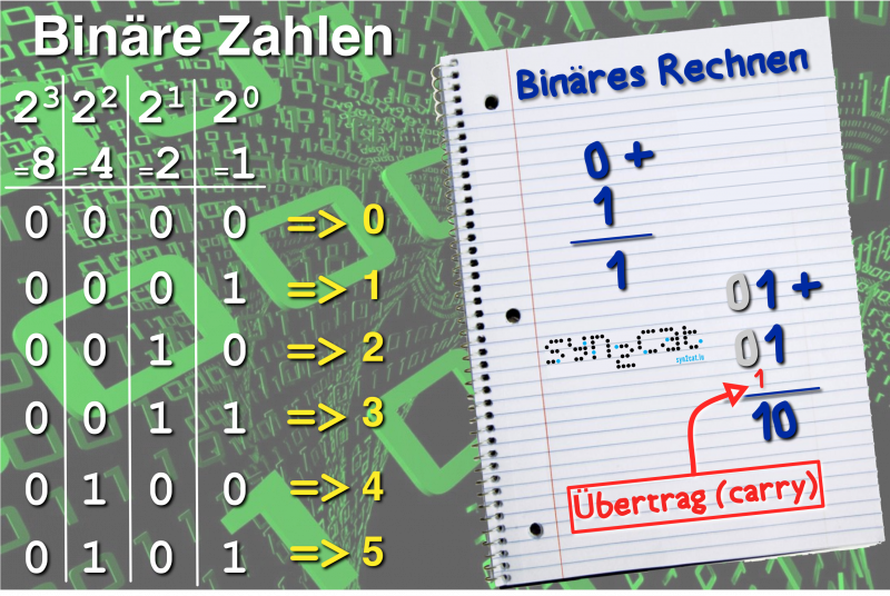 Poster showing how to add binary numbers, along with the numbers 1 to 5 in binary.